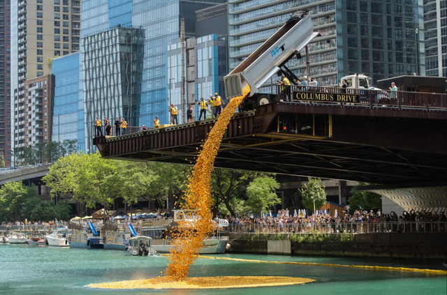 Chicago Sun Times70 тисяч жовтих гумових качечок в окулярах для плавання випустили у річку Чикаго у четвер, 5 серпня. Це зробили у рамках благодійної акції, спрямованої на збір коштів для організації Special Olympics Illinois, що допомагає спортсменам з особливими потребами.