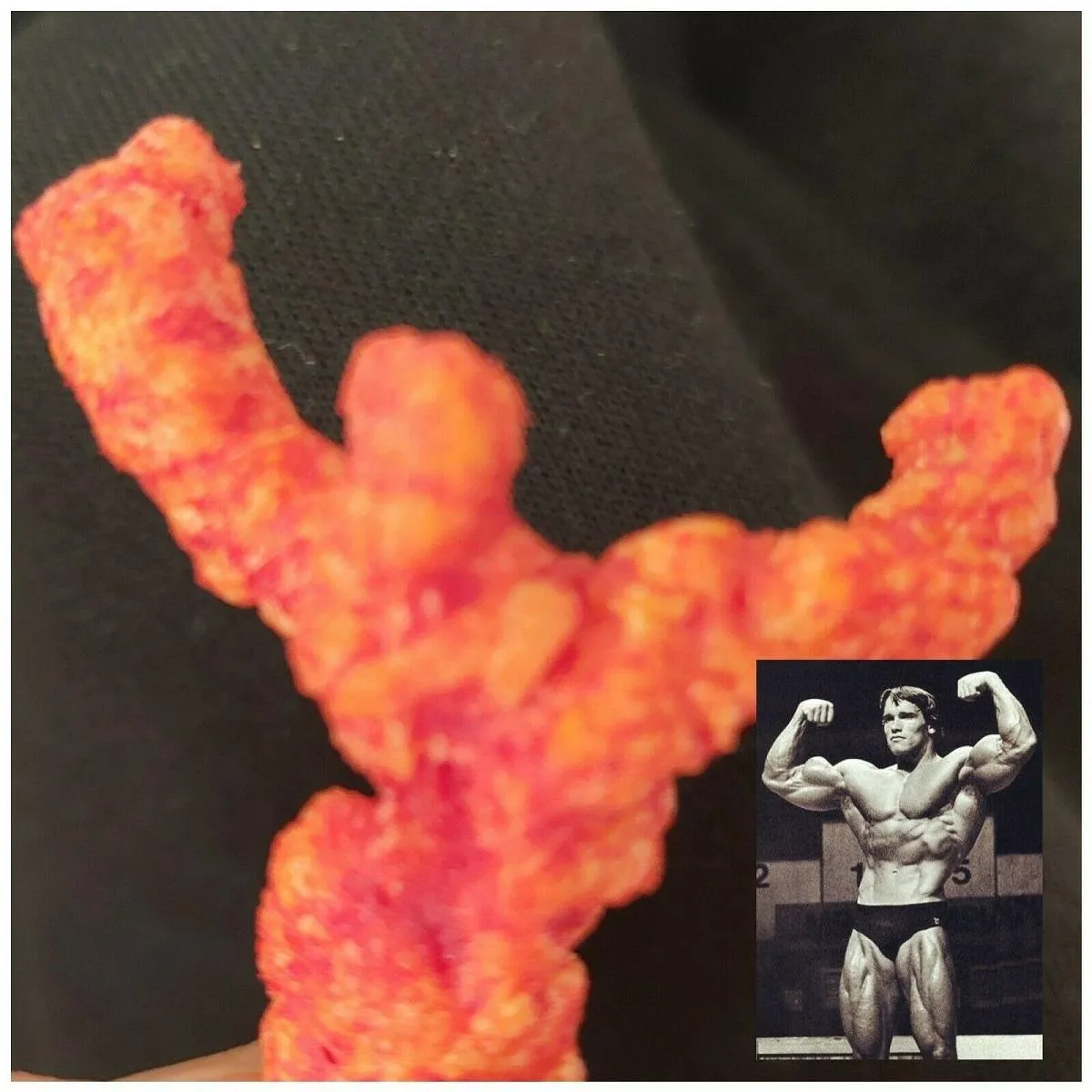 Чипс і справді нагадує Арнольда Шварценеггера на популярній світлині. Дивлячись на нього, можна розгледіти голову, тулуб та розведені мускулисті руки.