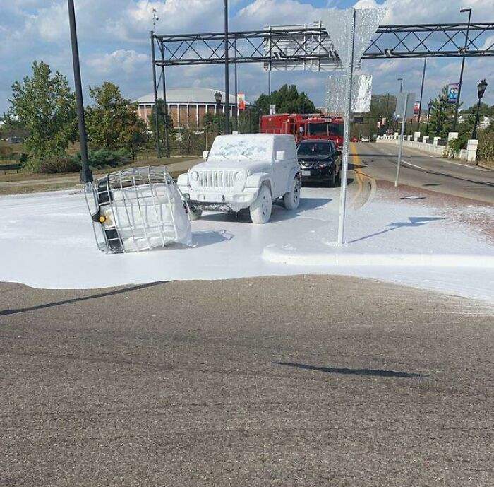 "Грузовик с цистерной с белой краской пролил ее на дорогу, и не только на дорогу"
