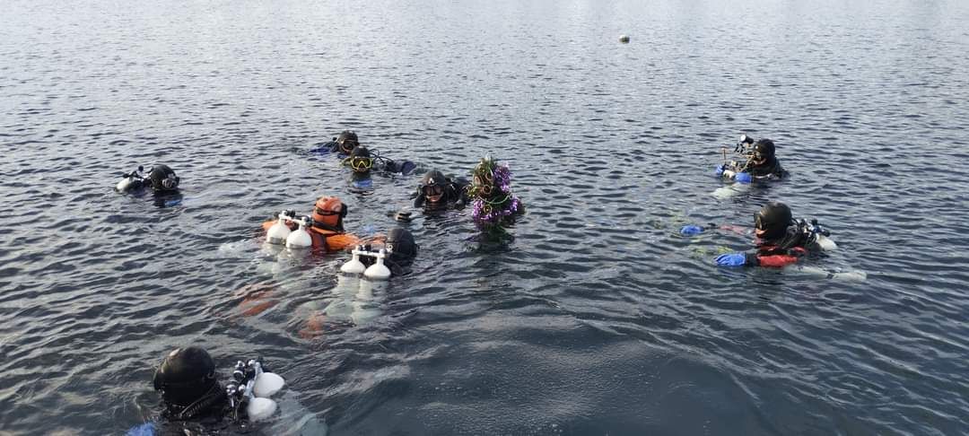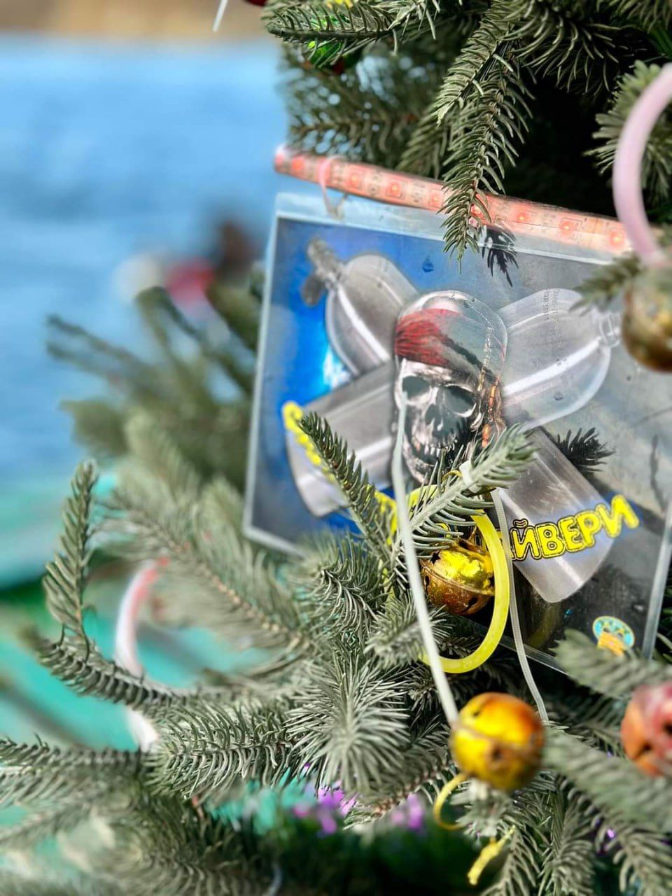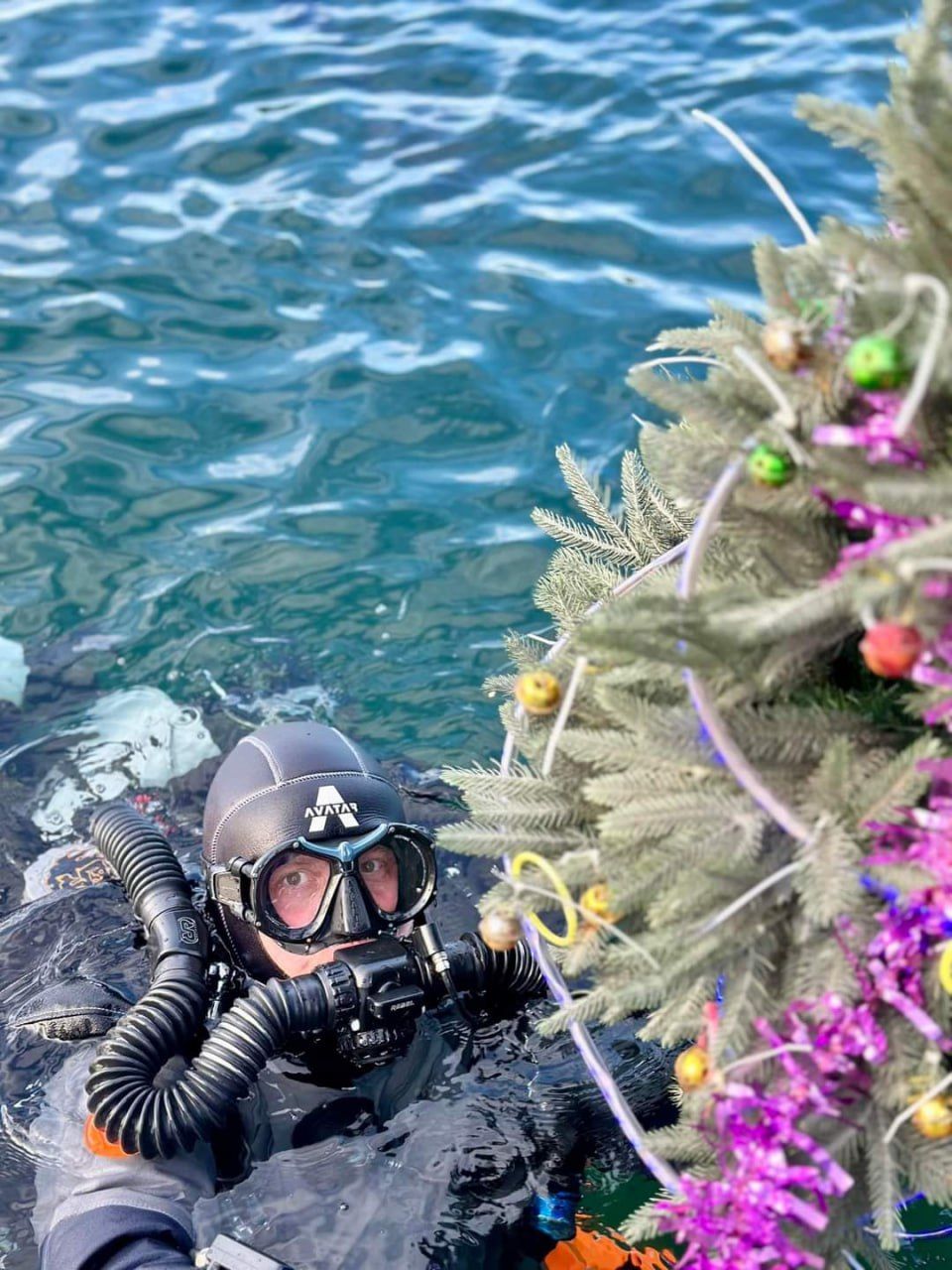 Теперь главный символ новогодних праздников находится не только на суше среди людей, но и под водой вместе с подводными жителями.