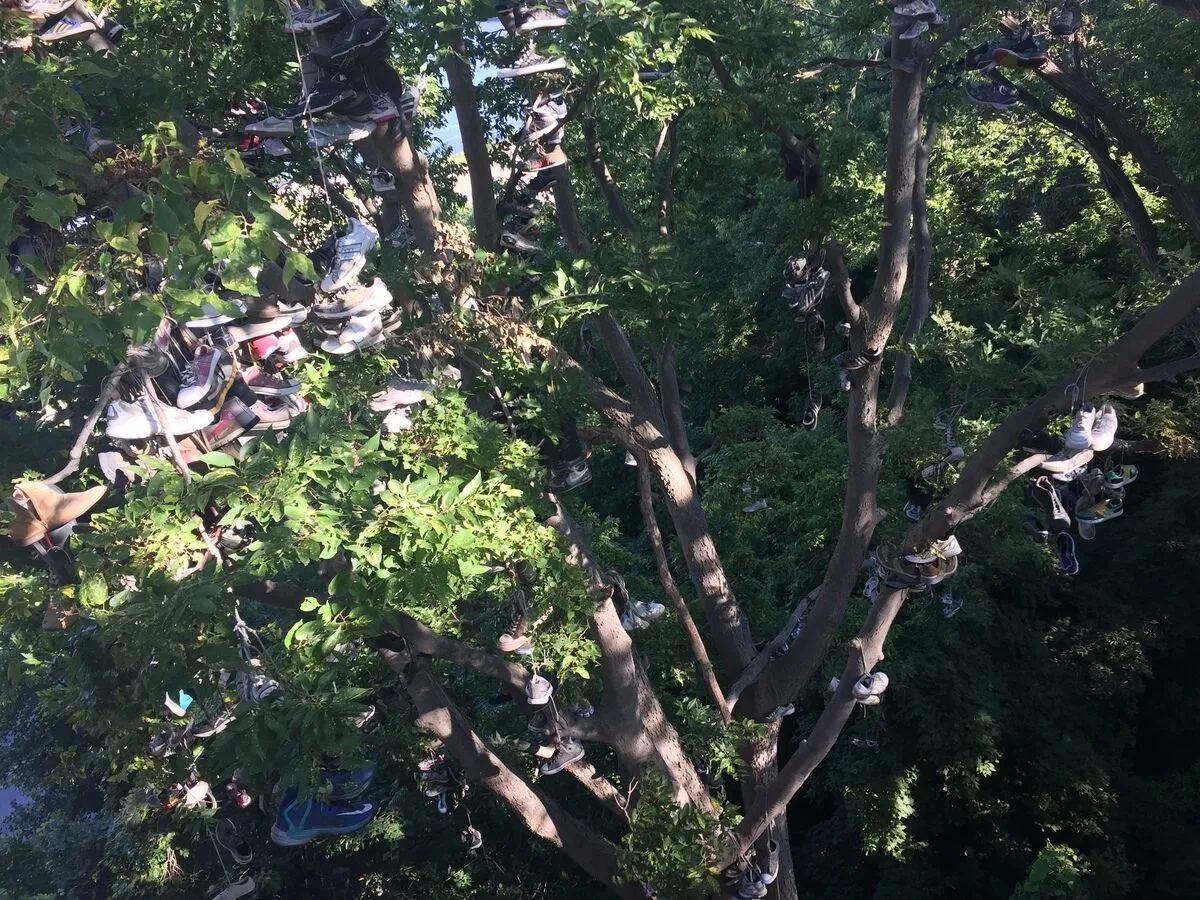 Проходячи по мосту Вашингтон-авеню, серед гілок можна побачити черевики, кросівки, капці і навіть ковзани.